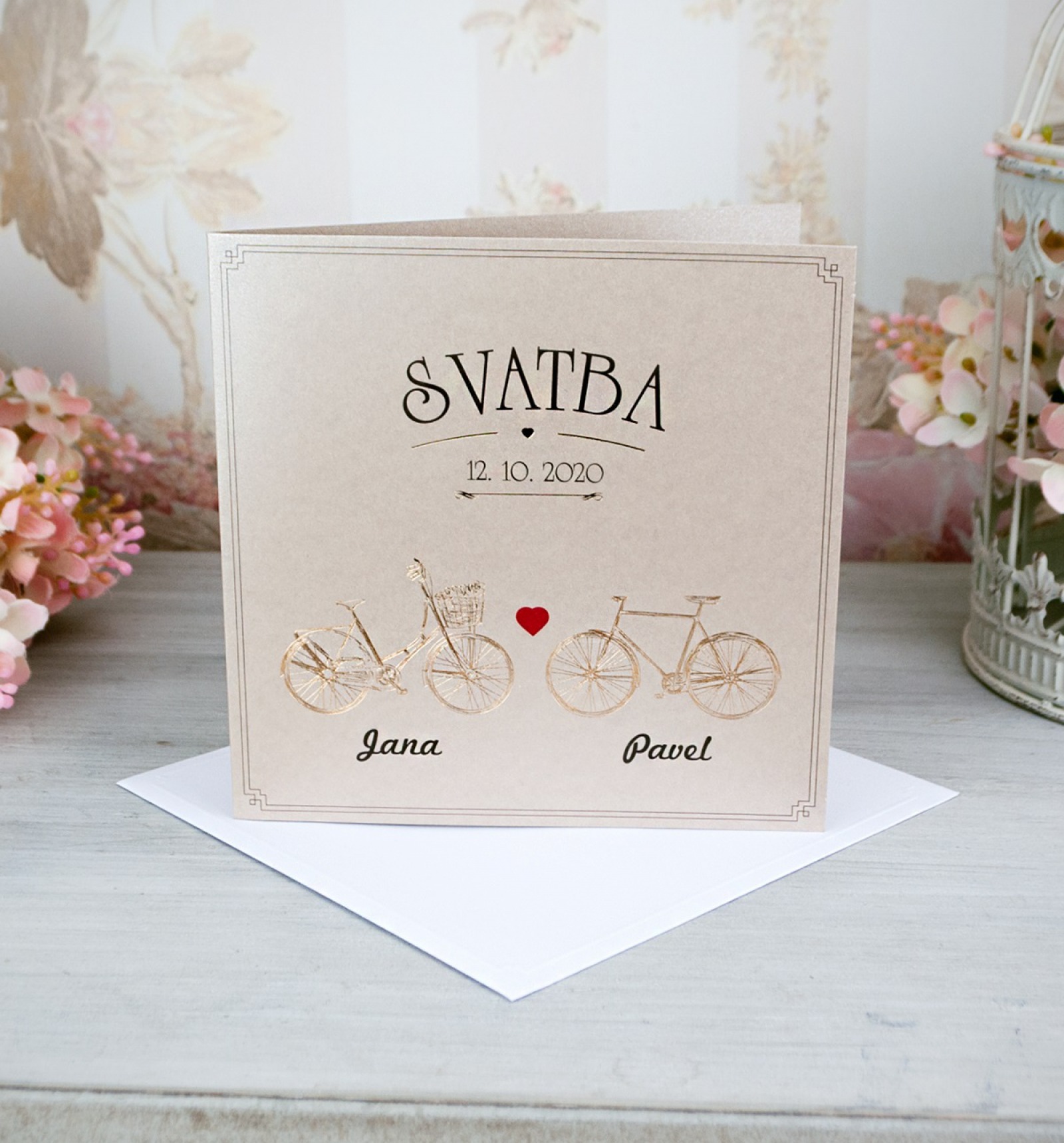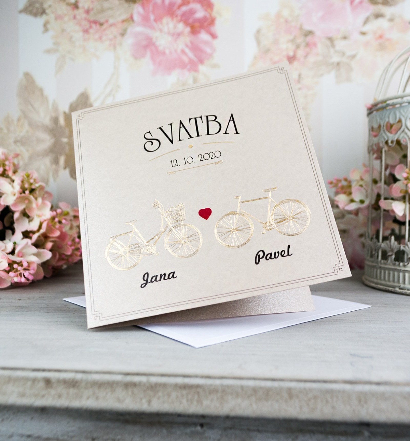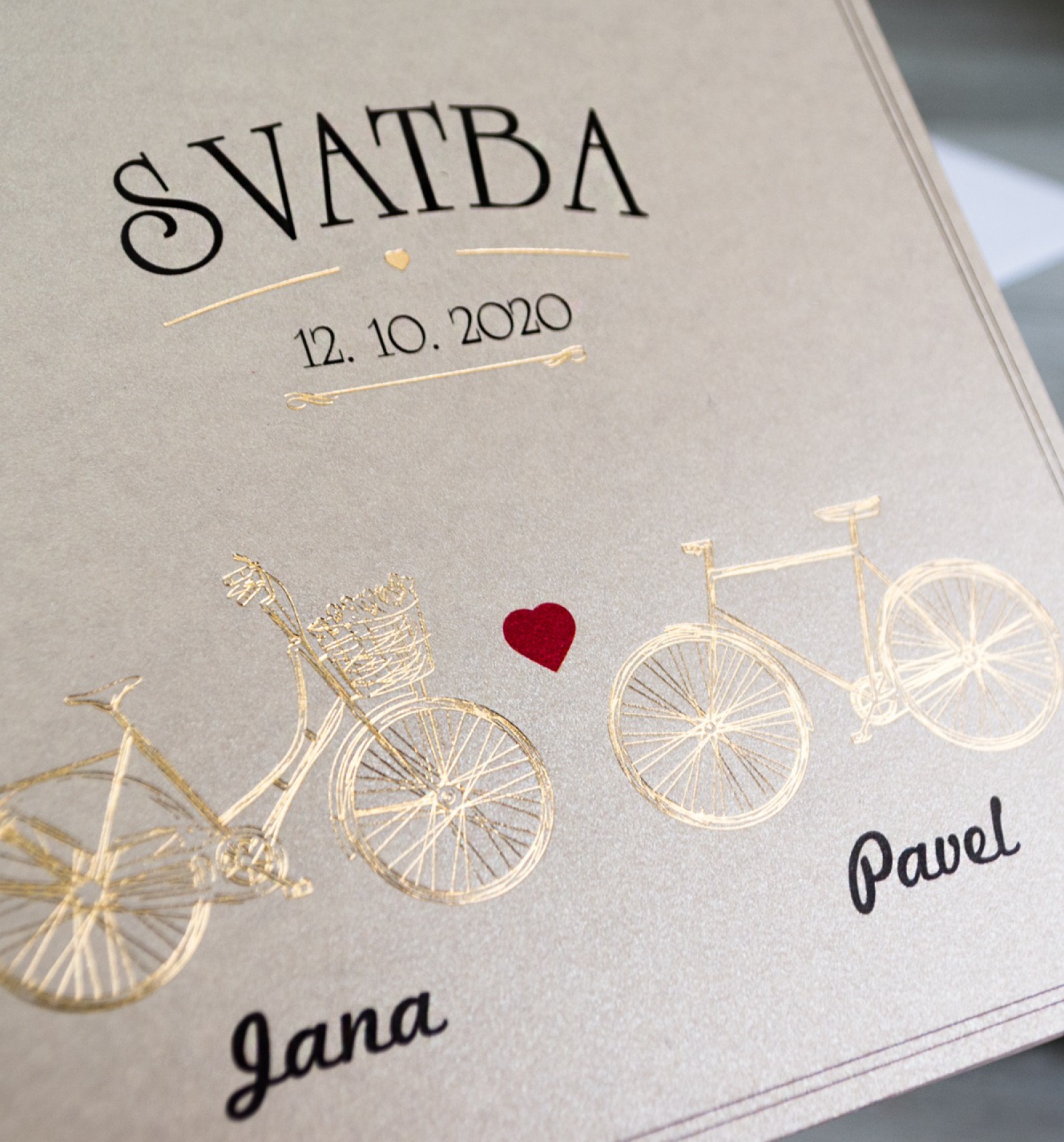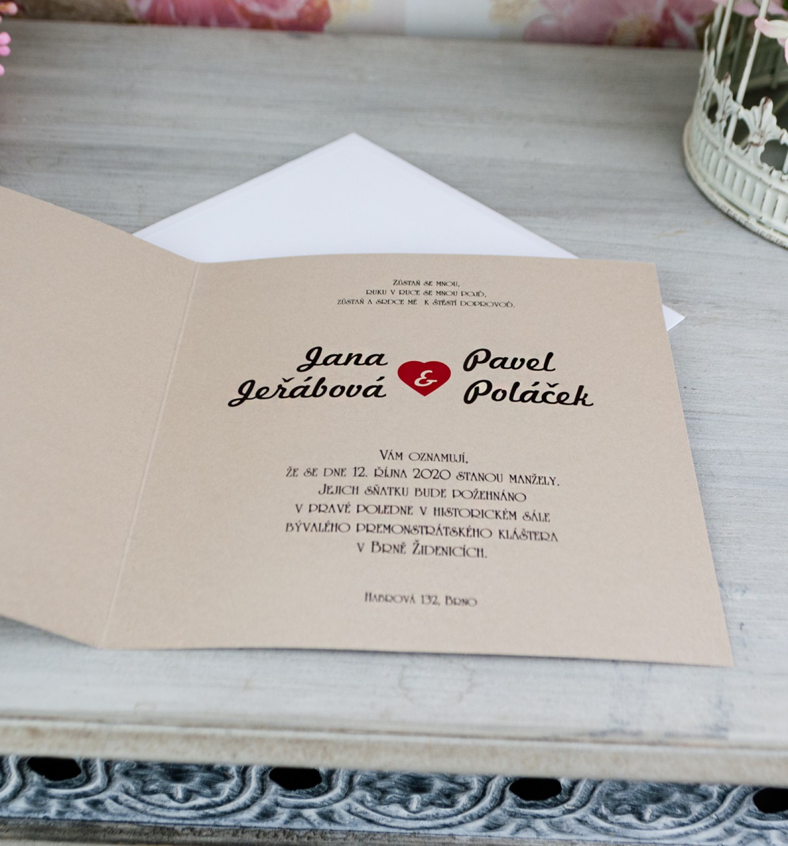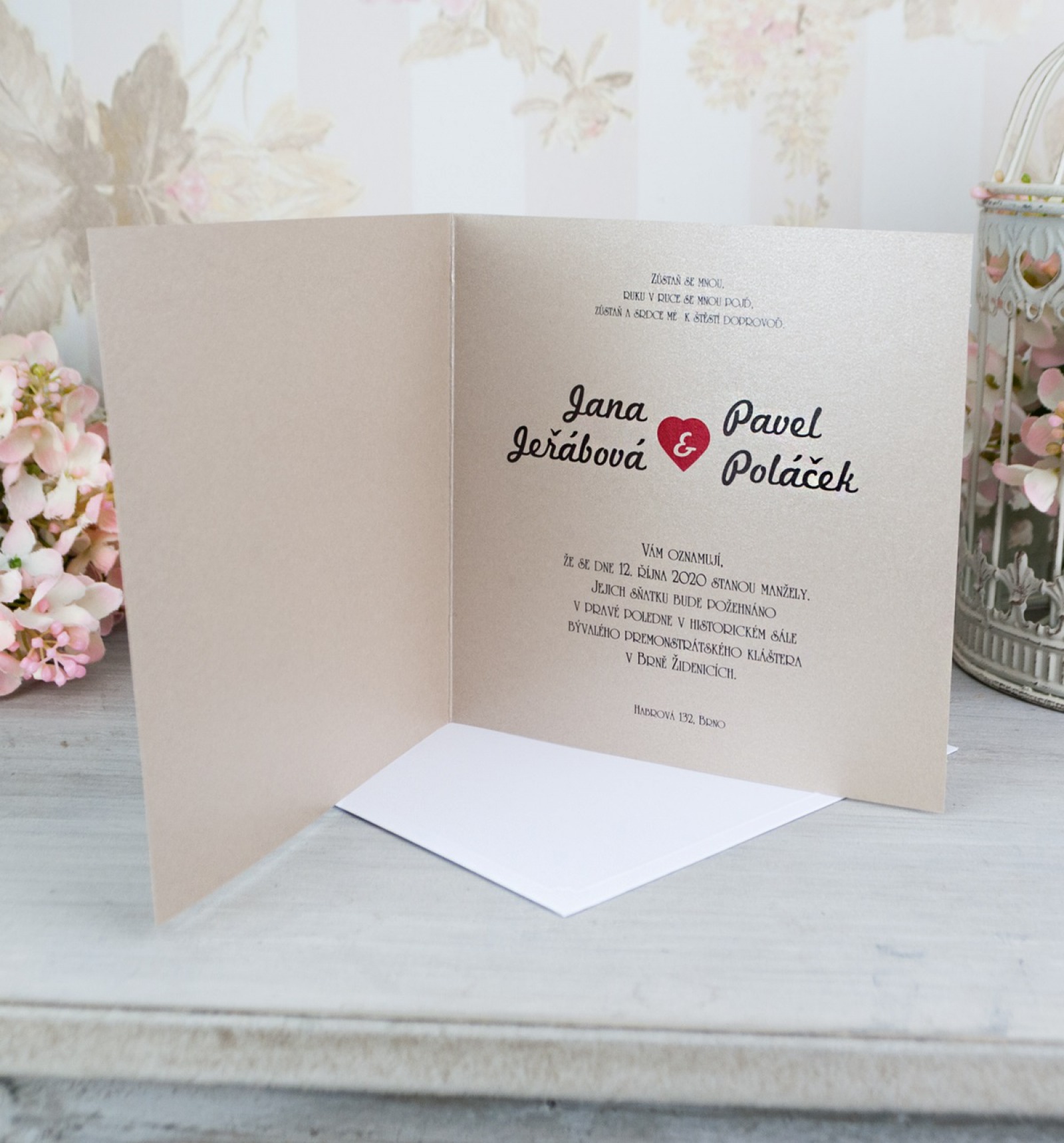 Krásná, romantická novinka letošní sezóny. Otevírací svatební oznámení ve vintage stylu. Použili jsme perleťový papír pískové barvy a celý design přední strany vytvořili kombinací lesklé ražby a digitálního tisku.