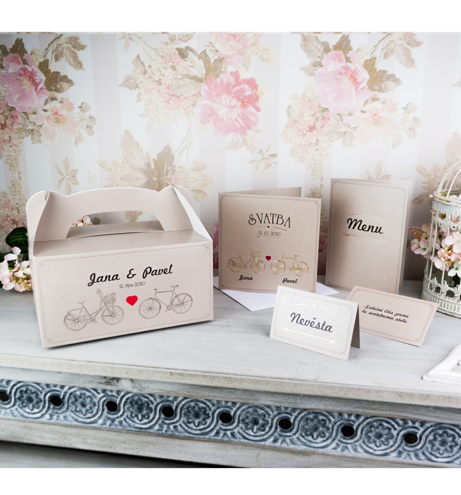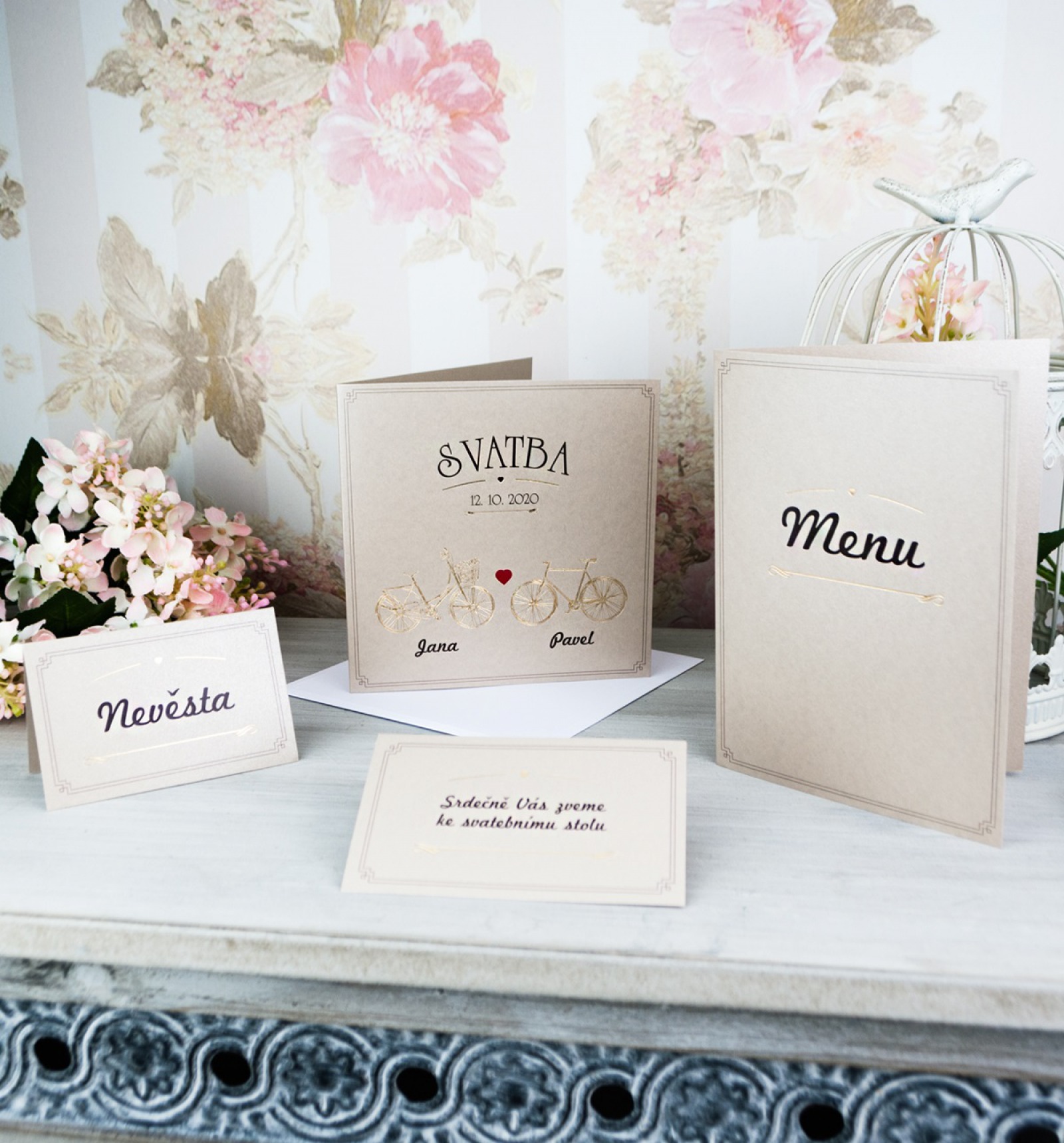 si můžete objednat obálku, dále pozvánky a jmenovky. Pokud byste uvažovali o Menu nebo krabičce na výslužku, tak i to v naší nabídce najdete ve stejně laděném duchu celého setu.